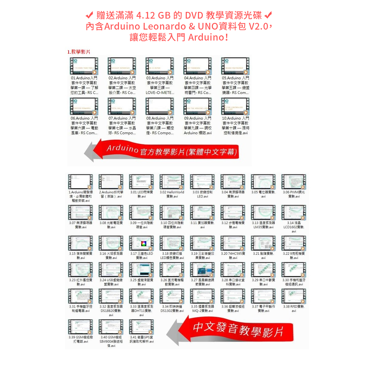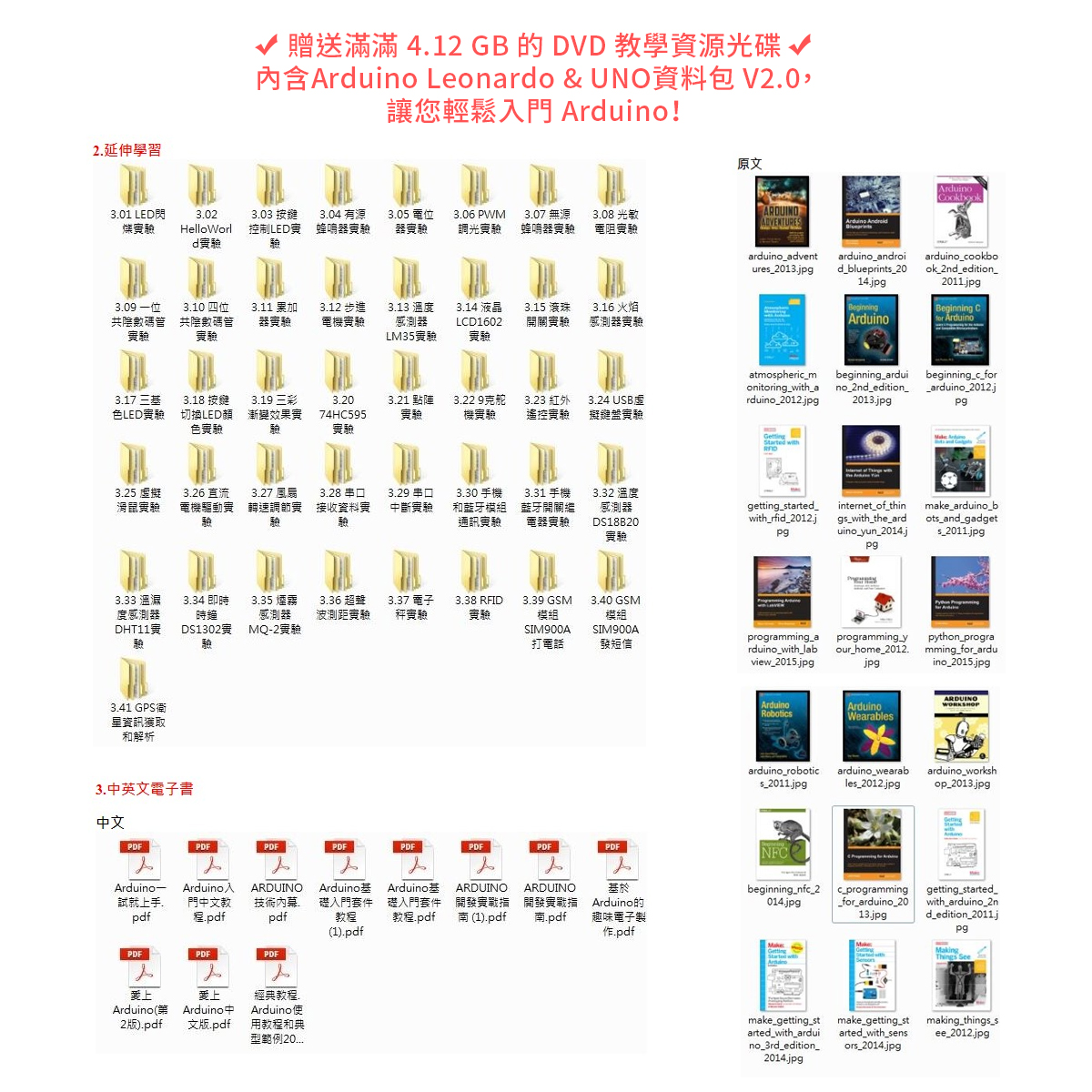 贈送滿滿 4.12 GB 的 DVD 教學資源光碟,內含 Arduino Leonardo & UNO 資料包 V2.0,讓您輕鬆入門 Arduino。