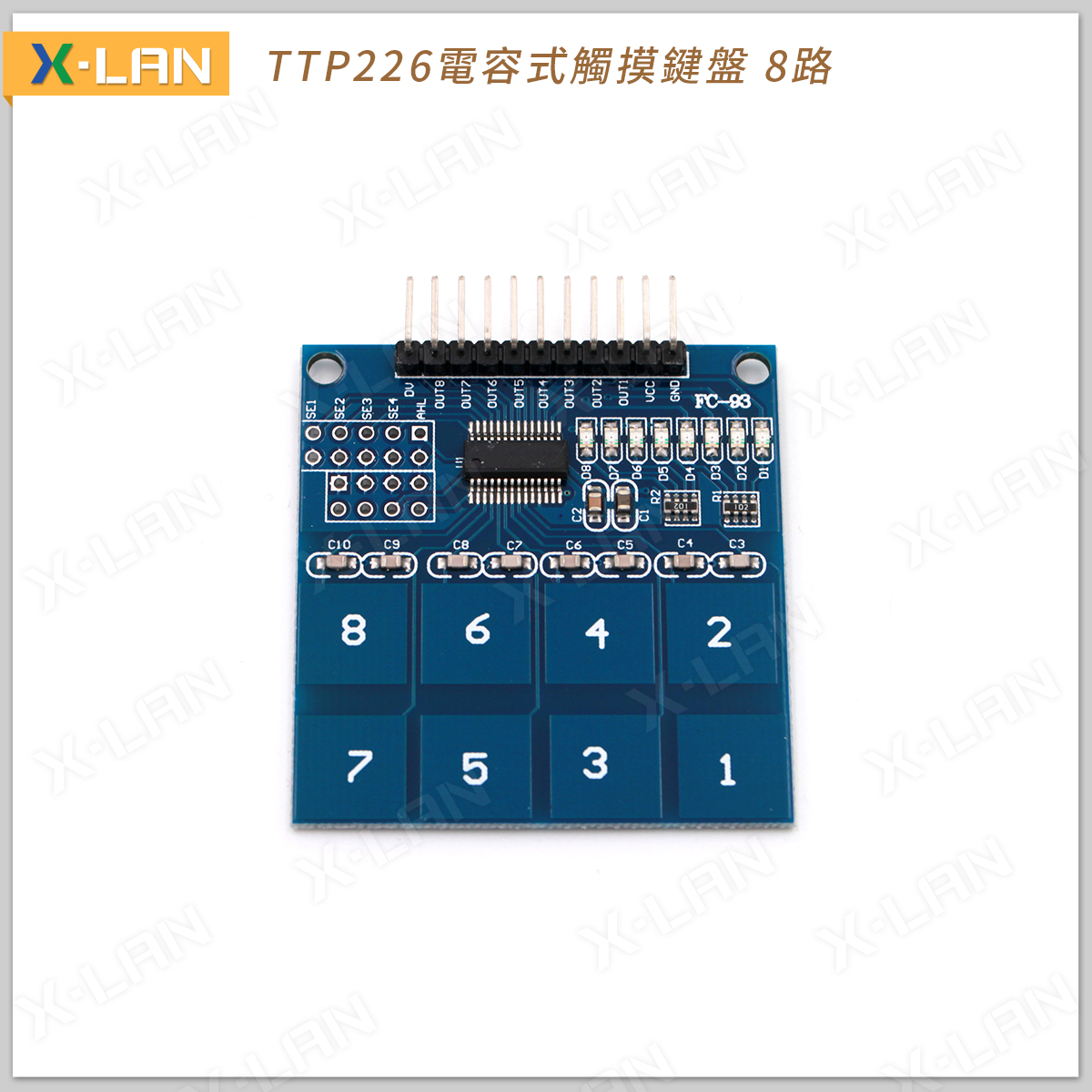1.板載 TTP226 電容式 8 鍵觸摸感應 IC。